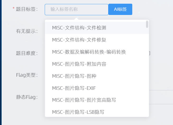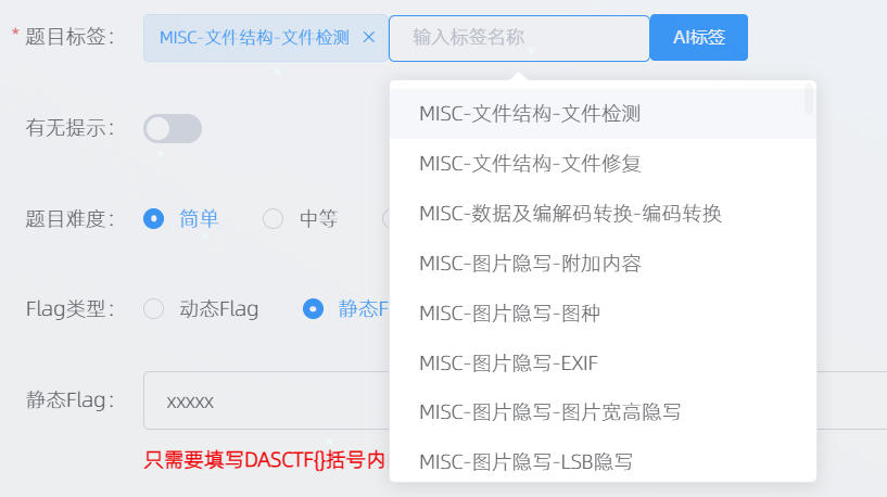 对于 MISC题目,选择 Flag类型为静态FLag,然后填写静态 Flag 的值即可。