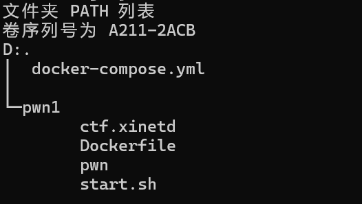- pwn1 – 服务构建文件,下有 Dockerfile 和构建所需的文件等