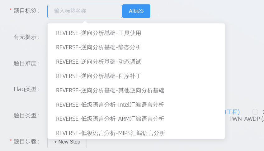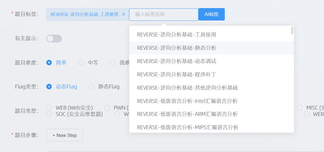对于 REVERSE题目,选择 Flag类型为静态FLag,然后填写静态 Flag 的值即可。